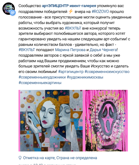 А потом наваливаются срочные дела по спасению мира и заблудших душ художников, коих необходимо приласкать на своем плече и зарядить энергией, дабы без этого они просто сдуваются и нет сил творить...Или, наоборот, необходимо раздать кучу золотых и платиновых пенделей, чтобы колесо некоторых творцов начало крутиться в нужную сторону, а не пробуксовывало)И вот, пока я разгребала Авгиевы конюшни, мир бежал впереди меня! И после прекрасного , душевного вечера в #ROZOVO, начали приходить потрясающие новости от @residentxx1 (Арман Райн) и @ritagrigru (Маргарита Григ) Оказывается, я еще и претендент на почетное место) Весьма приятно)