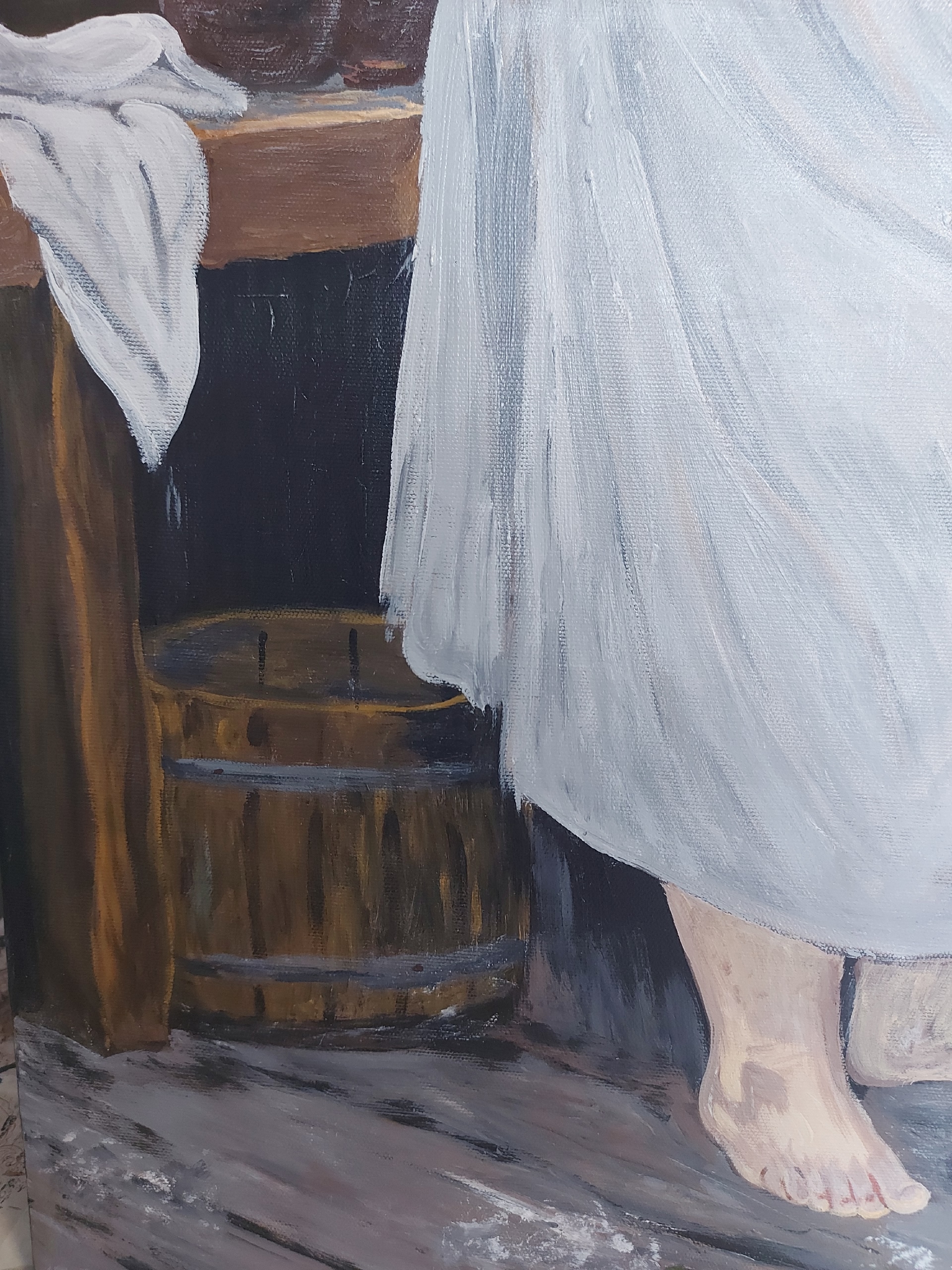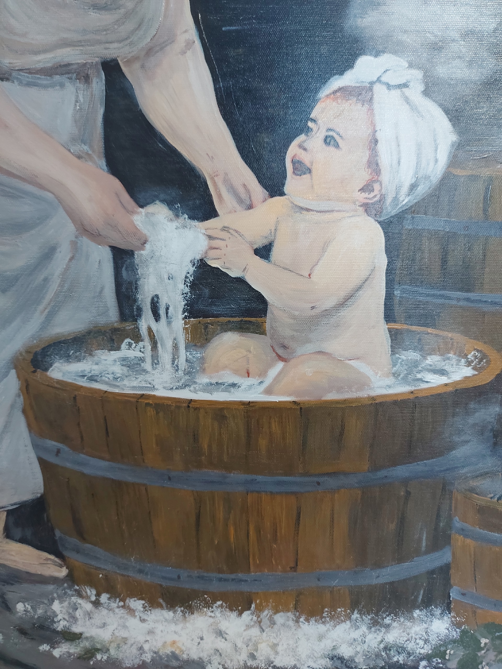 painting depicts a touching moment: a woman lovingly bathes a baby in a wooden