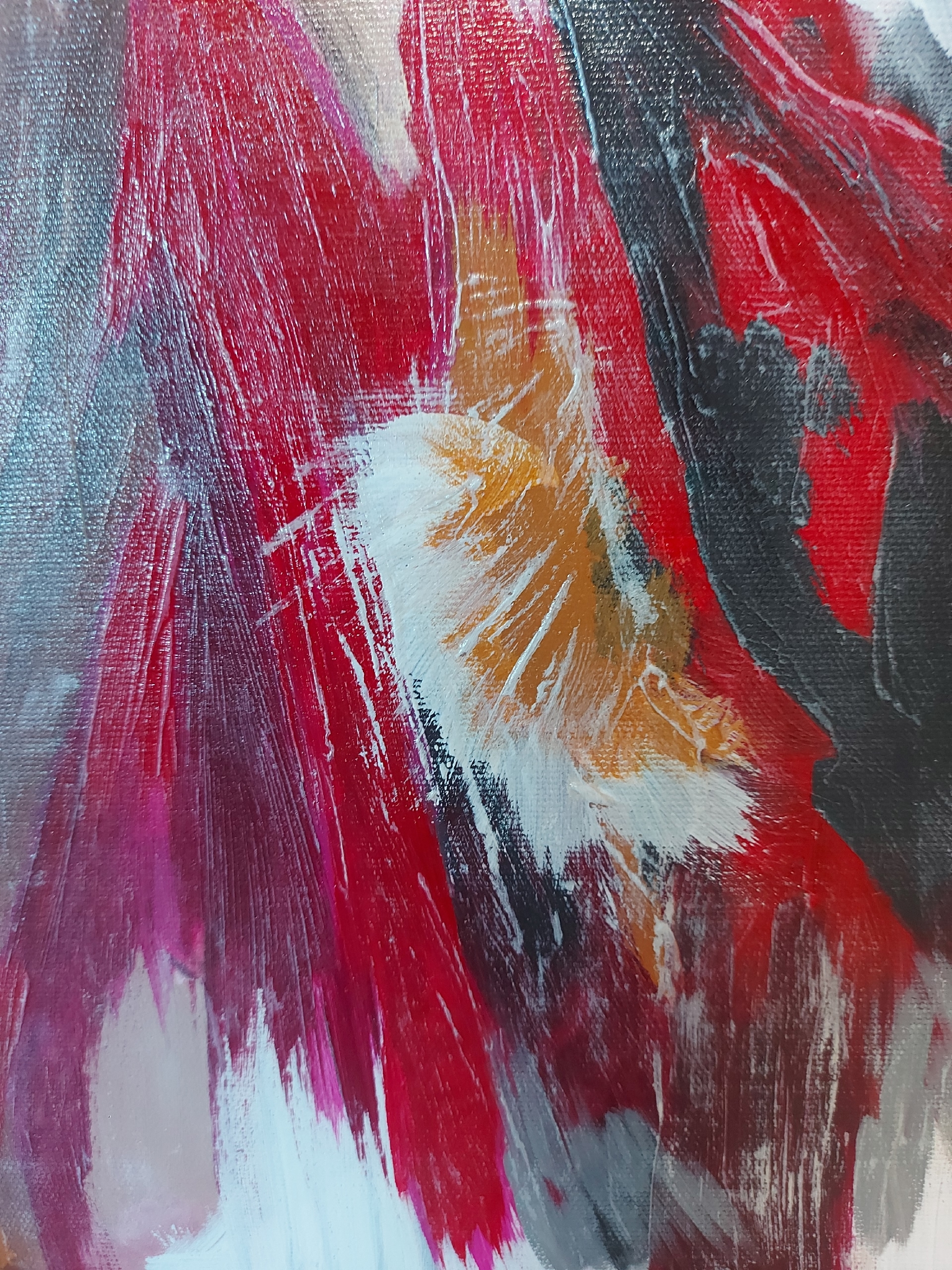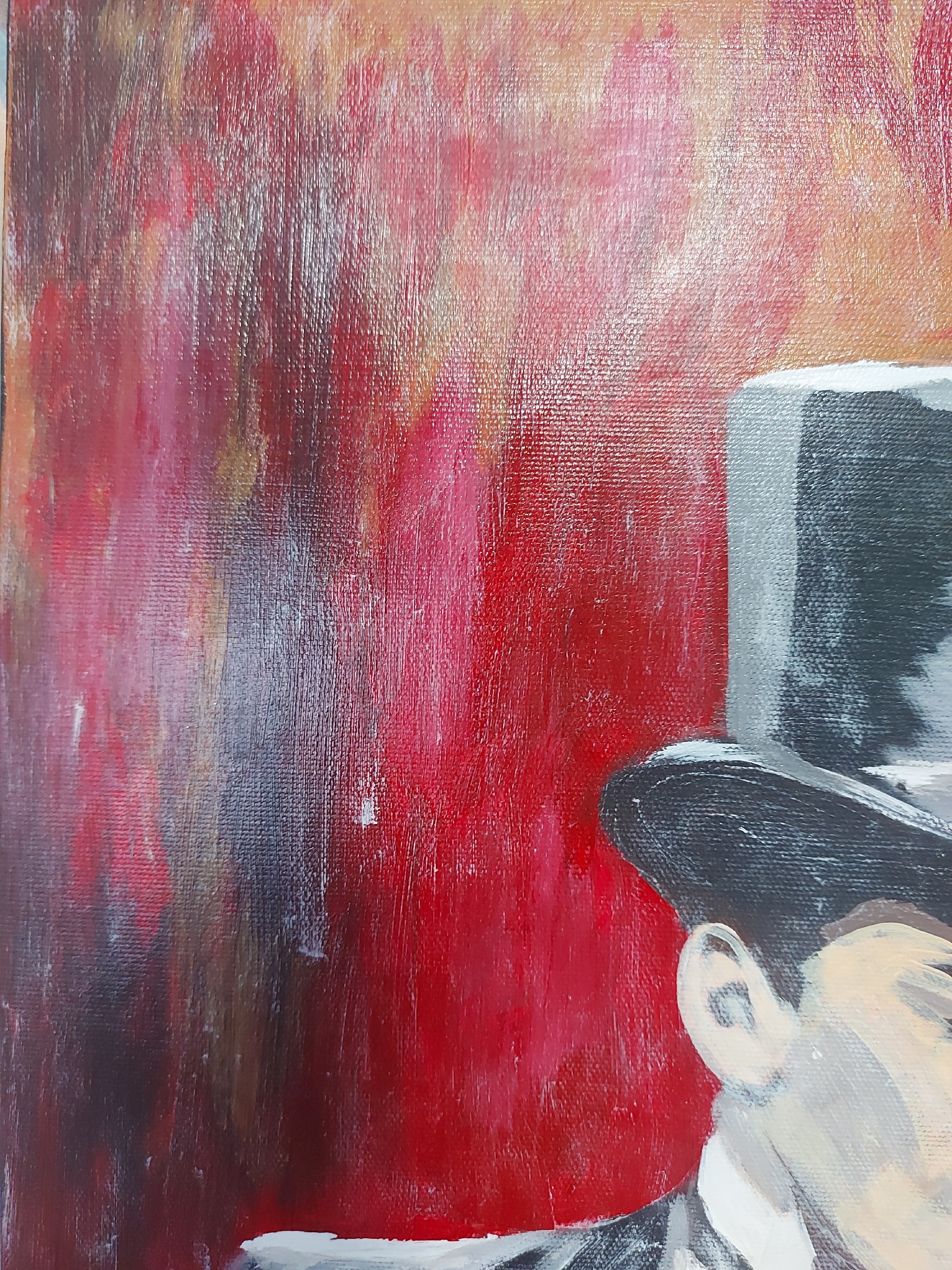 Фон картины — вихрь красно-оранжевых мазков, создающих ощущение жара, напряжения, почти удушающей атмосферы бара. Это не просто место действия, а эмоциональный фон, подчёркивающий внутренний конфликт героини. Красные акценты на платье и в фоне перекликаются, создавая ощущение крови, страсти, опасности.
