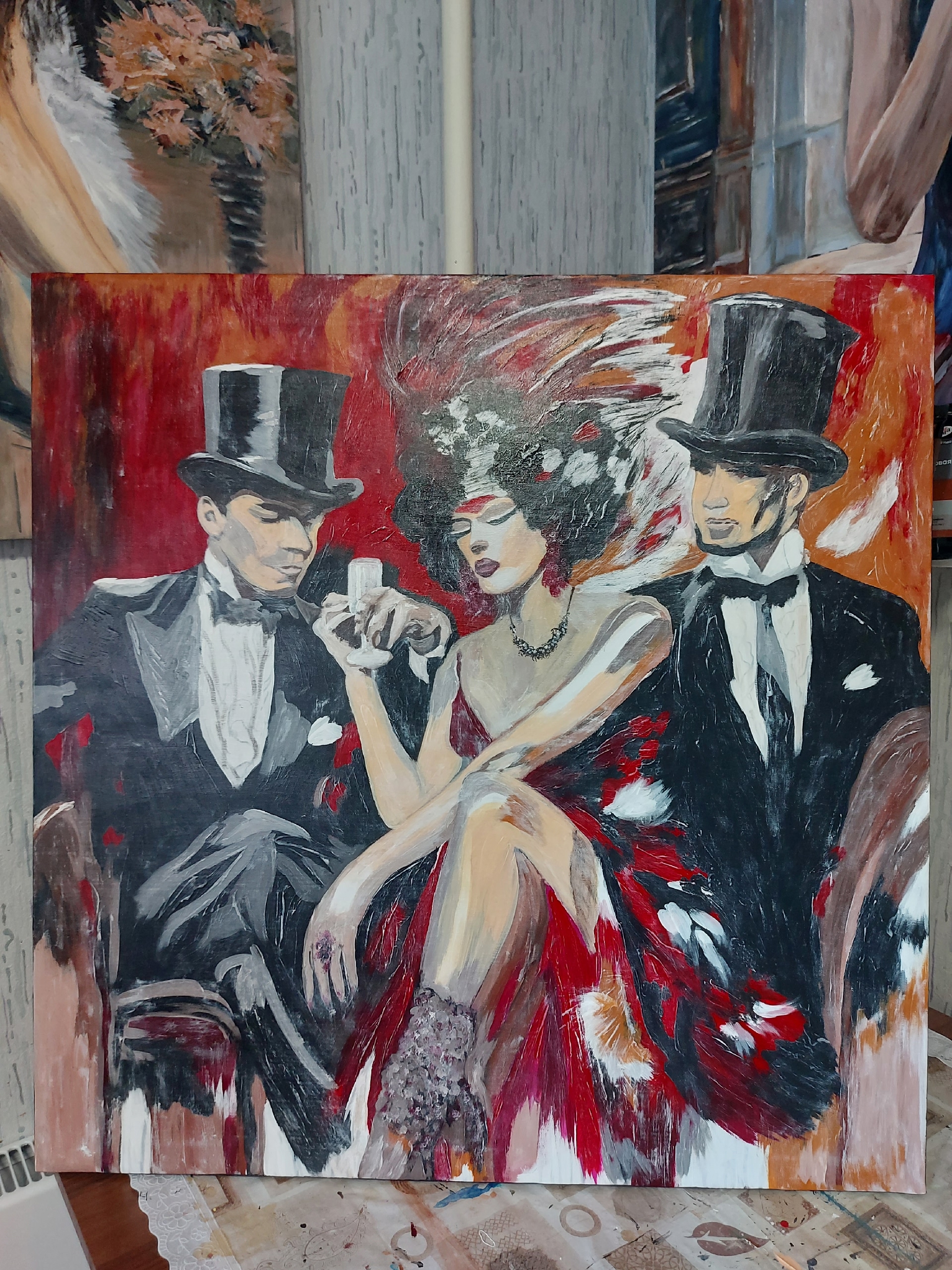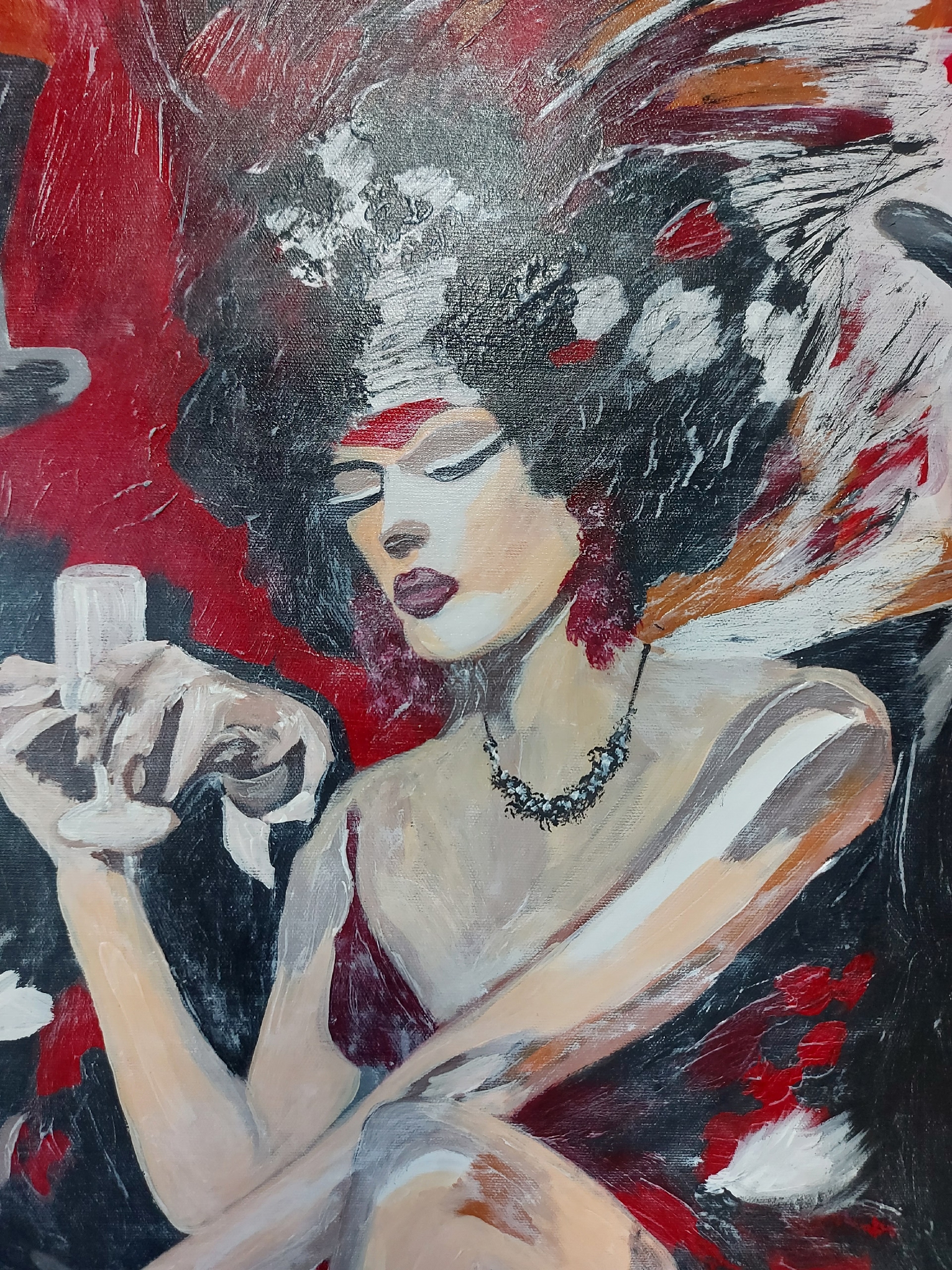 Картина взрывается страстью и драматизмом, словно кадр из гламурного нуара. В центре композиции — она, воплощение роковой красоты: женщина в роскошном красном платье, похожем на языки пламени, которые готовы обжечь каждого, кто приблизится слишком близко. Её поза — расслабленная, но полная скрытого напряжения: нога изящно перекинута через ногу, рука с бокалом вина застыла в воздухе, будто в мгновении перед решительным отказом.