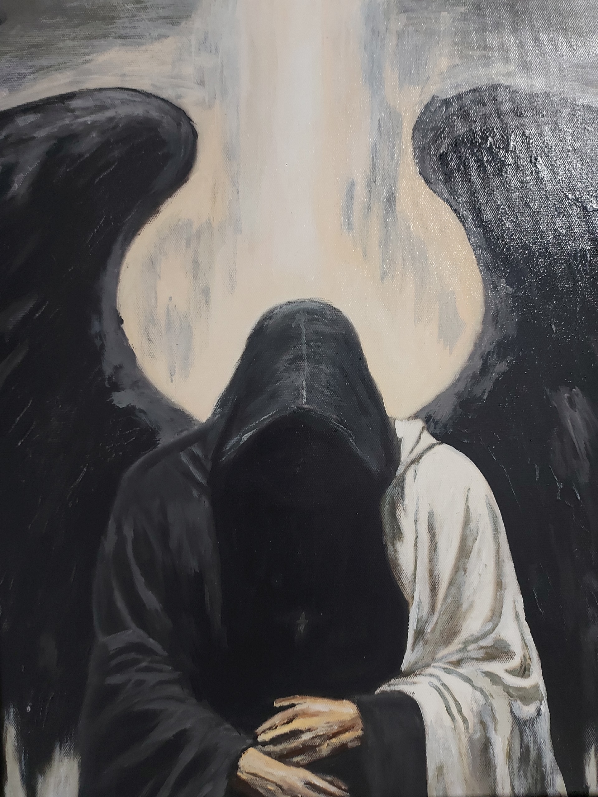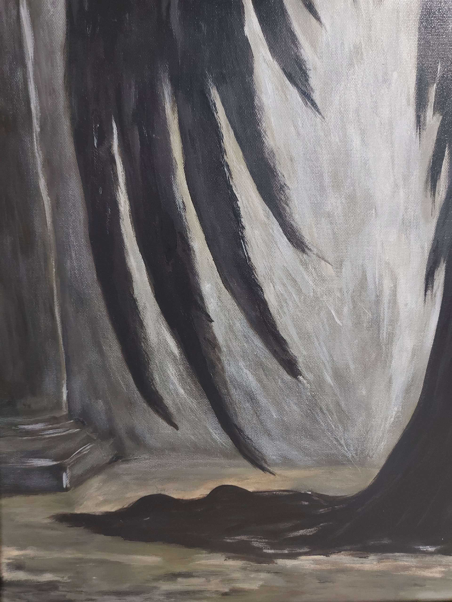 одежды, с огромными чёрными крыльями. Поза персонажа — склоненная голова,