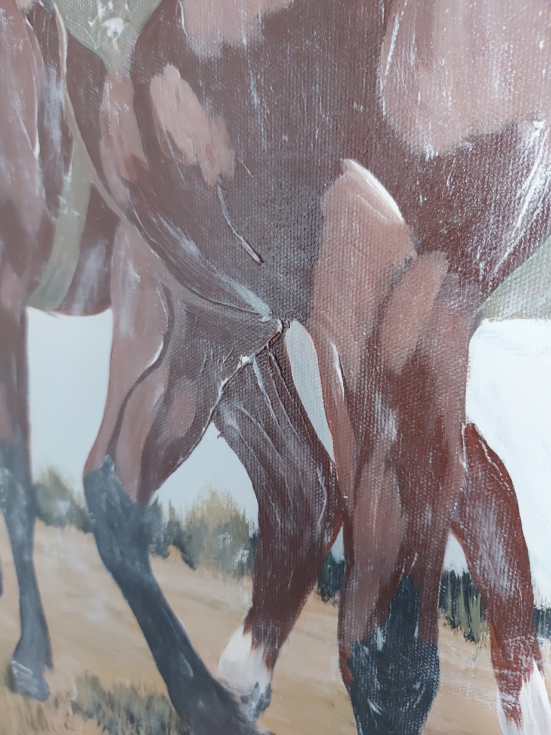 *Лошади — неотъемлемая часть татарского кочевого наследия. Две мощные, ухоженные лошади изображены в движении, что придаёт картине динамику. Их тёмная масть с белыми отметинами на ногах подчёркивает природную красоту и силу животных. Вторая лошадь, идущая чуть позади, усиливает ощущение глубины пространства.