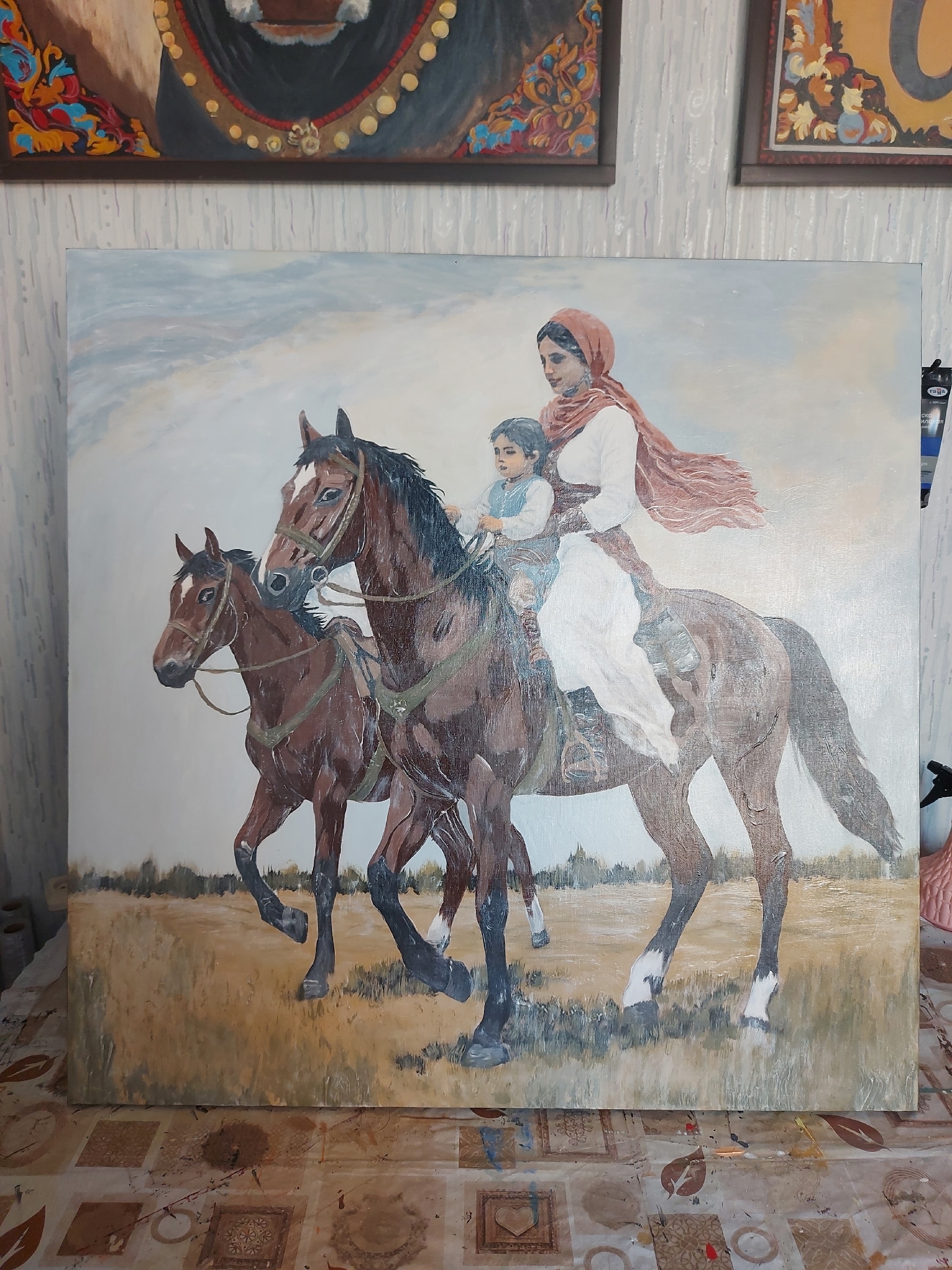 Картина выполнена на холсте акриловыми красками, размер — 80х80 см. На полотне запечатлён трогательный момент из жизни татарской семьи: женщина и ребёнок едут верхом на лошадях по просторам степного пейзажа. Композиция наполнена теплом, спокойствием и ощущением неразрывной связи человека с природой, а также подчёркивает национальные особенности татарского быта.